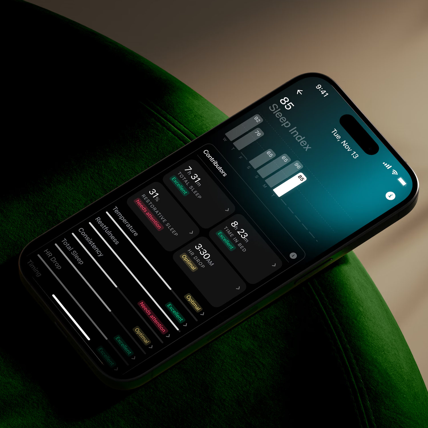 透過以下指標,深入了解您的睡眠質量與時長:睡眠總時長、靜息心率 (RHR)、睡眠安穩度,以及包括快速眼動 (REM)、深睡和淺睡等睡眠階段的數據分析。