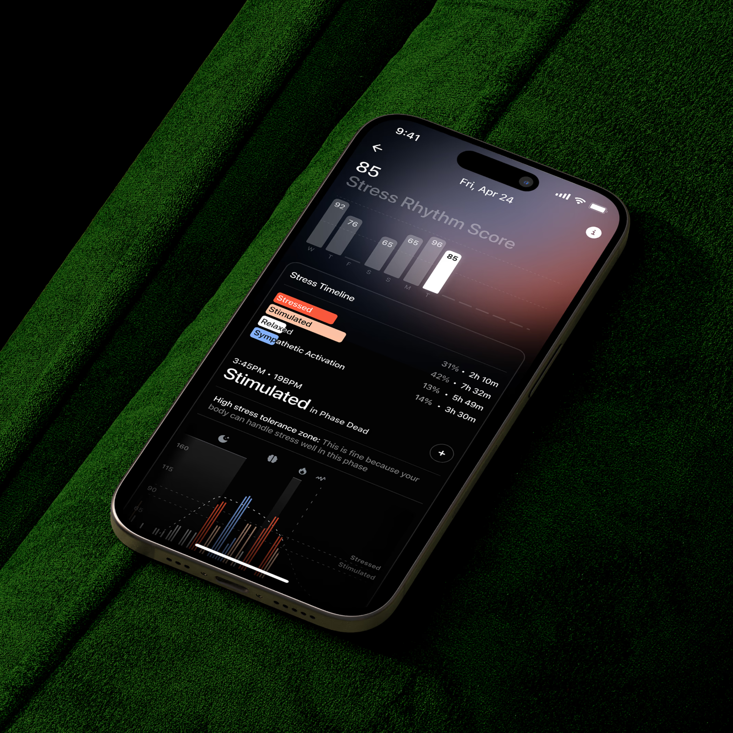 一項全新的功能,幫助您解讀壓力情況。此分數綜合考慮心率 (HR)、心率變異性 (HRV) 和靜息心率 (RHR) 的變化,並結合您的生理節律,提供詳細的壓力評估。它可以告訴您當下的狀態是「受刺激」、「放鬆」還是「壓力中」。